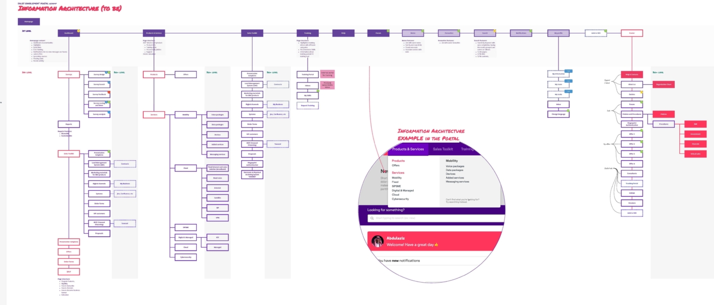 After closing the structure I started drafting the solution. Before anything else, I like to define all the navigation (Mobile, Tablet and Desktop). Afterwards, a first draft for the entire portal was created using Miro.